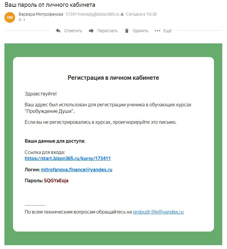 Сразу после регистрации вам на e-mail пришло письмо с доступом на платформу (проверьте пожалуйста папку «Входящие», а возможно и «Спам»). Письмо выглядит так, как на картинке ниже. Отправитель - noreply@skillspace.ru Тема письма: Вы получили доступ к курсу «СИЛА МАТЕРИ ЗЕМЛИ, Бесплатный онлайн-интенсив»
